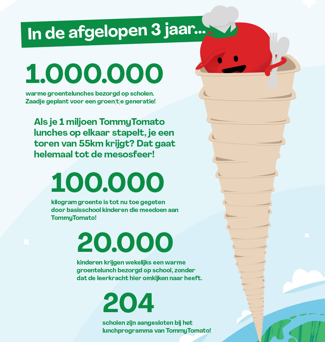 TommyTomato-medeoprichter Bas Turk is trots. “Dit is niet alleen een mooie mijlpaal voor ons, maar ook voor de kinderen van Nederland”, zegt hij. “Te veel kinderen eten nog ongezond. Niet alleen door armoede, maar ook door kennisarmoede: veel ouders weten niet wat gezond is. Met onze groentelunch op school leren kinderen groenten eten, ook als dat thuis niet gestimuleerd wordt. En dat is een belangrijke vaardigheid voor een gezonde levensstijl. Plant een zaadje, oogst een gezonde generatie.”