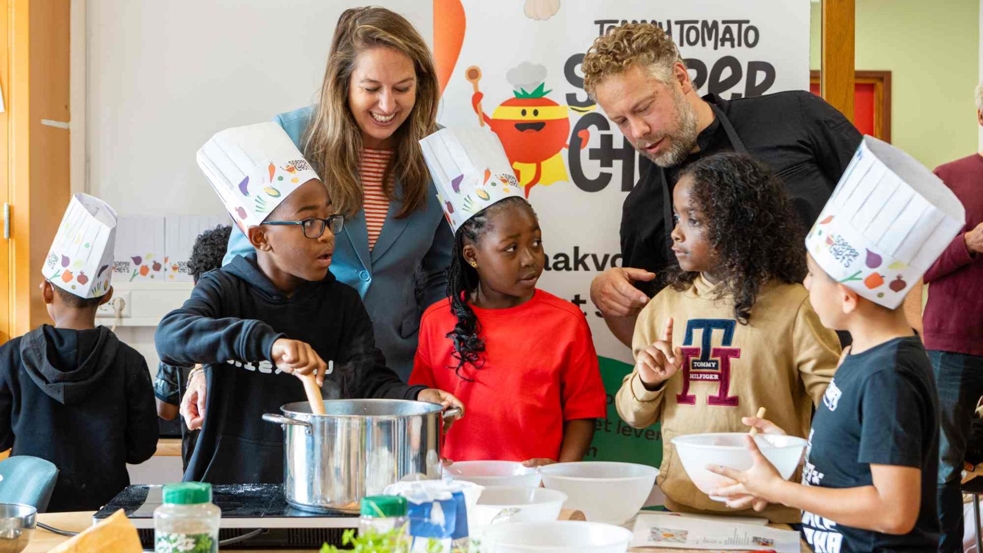 Op vrijdag 13 september gaf onze SoeperChef Bastiaan een wel heel bijzondere kookles op basisschool de Polsstok in Amsterdam-Zuidoost. Onderwijswethouder Marjolein Moorman kookte mee. Daarmee gaf zij het startsein voor de Groentecoalitie in Amsterdam. Ook in Haarlem, de IJmond, Haarlemmermeer, Den Bosch, Rotterdam, Zaanstad en Almere worden Groentecoalities opgericht. Het doel? Kinderen gezond laten opgroeien.