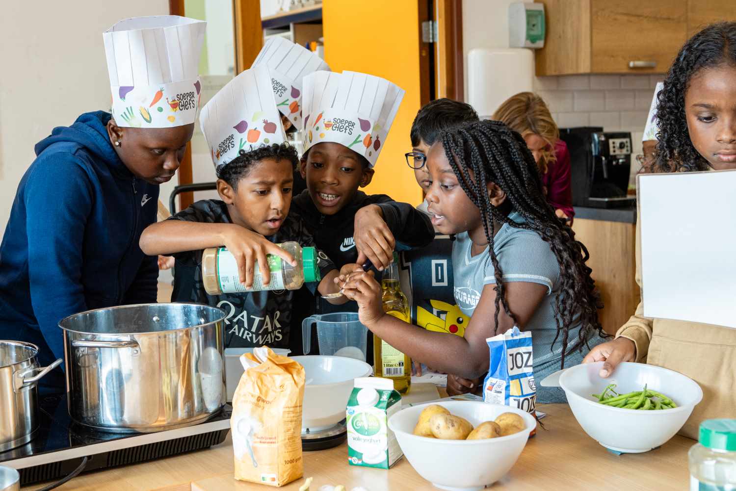 Op vrijdag 13 september gaf onze SoeperChef Bastiaan een wel heel bijzondere kookles op basisschool de Polsstok in Amsterdam-Zuidoost. Onderwijswethouder Marjolein Moorman kookte mee. Daarmee gaf zij het startsein voor de Groentecoalitie in Amsterdam. Ook in Haarlem, de IJmond, Haarlemmermeer, Den Bosch, Rotterdam, Zaanstad en Almere worden Groentecoalities opgericht. Het doel? Kinderen gezond laten opgroeien.
