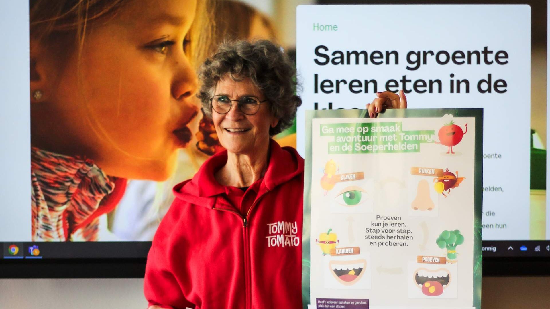 “Klopt. Maar voor ik dat doe, vertel ik ons verhaal. Ik vertel dat we warme lunches bezorgen in de klas en dat die lunch vol met groente zit. Dan leg ik uit wat groente voor je lichaam doet. Dan pak ik een poster en vertel dat je met al je zintuigen kunt proeven. Dus ook met je ogen en je neus. ‘En jullie gaan dat proeven’, zeg ik dan. ‘En wij willen heel graag weten wat jullie ervan vinden.’ Dat vinden ze heel interessant, zo voelen ze zich belangrijk.”