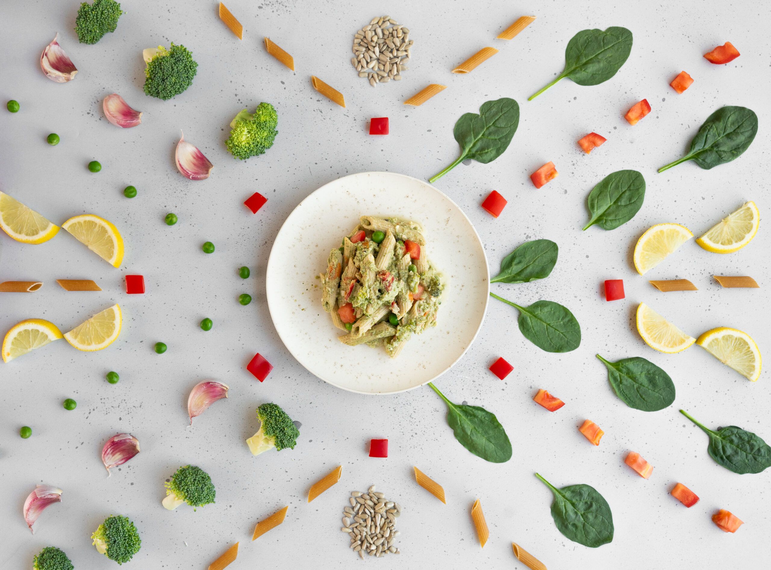 Broccoli, tomaat, spinazie, rode paprika en doperwten.
