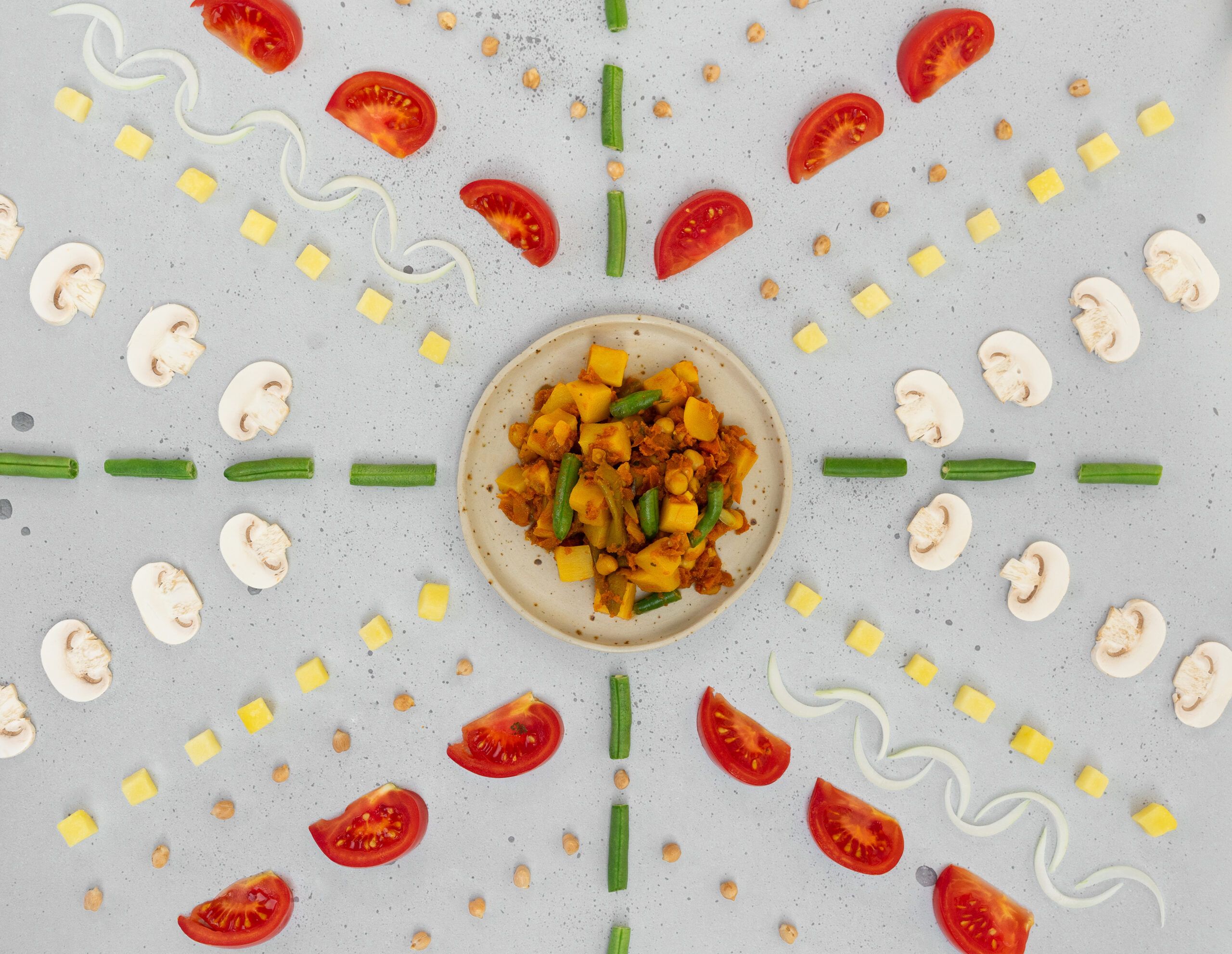 Aardappel, kikkererwten, tomaat (10%), water, sperziebonen (7%), ui (5%), tomatenpuree (5%), raapzaadolie, champignon (3%), rozijnen, tapiocazetmeel, kruiden en specerijen (MOSTERD, SELDERIJ), knoflook, zout, erwteneiwit, zonnebloemolie.