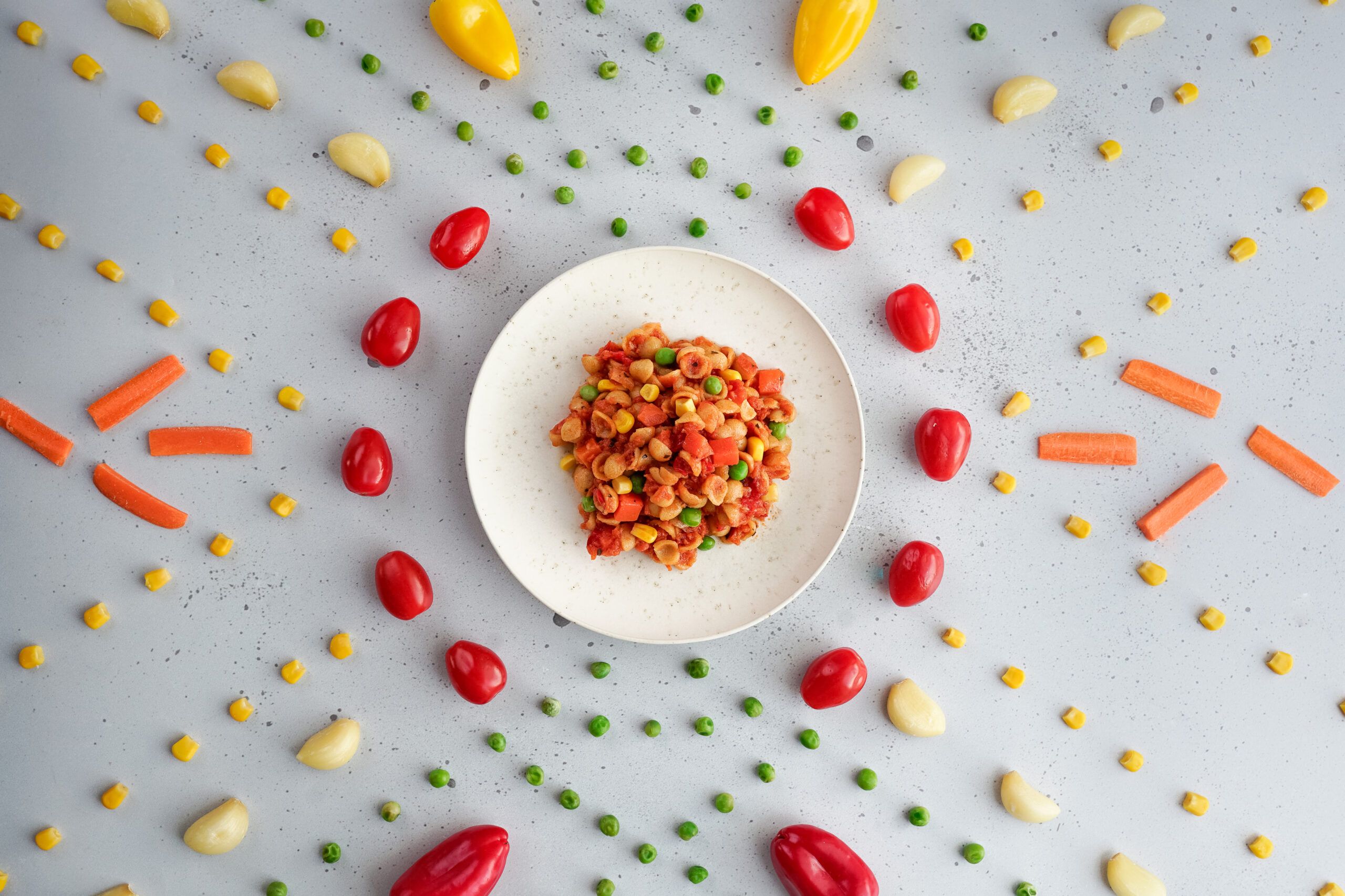 Wortel, paprika, tomaat, maïs, doperwten en ui.