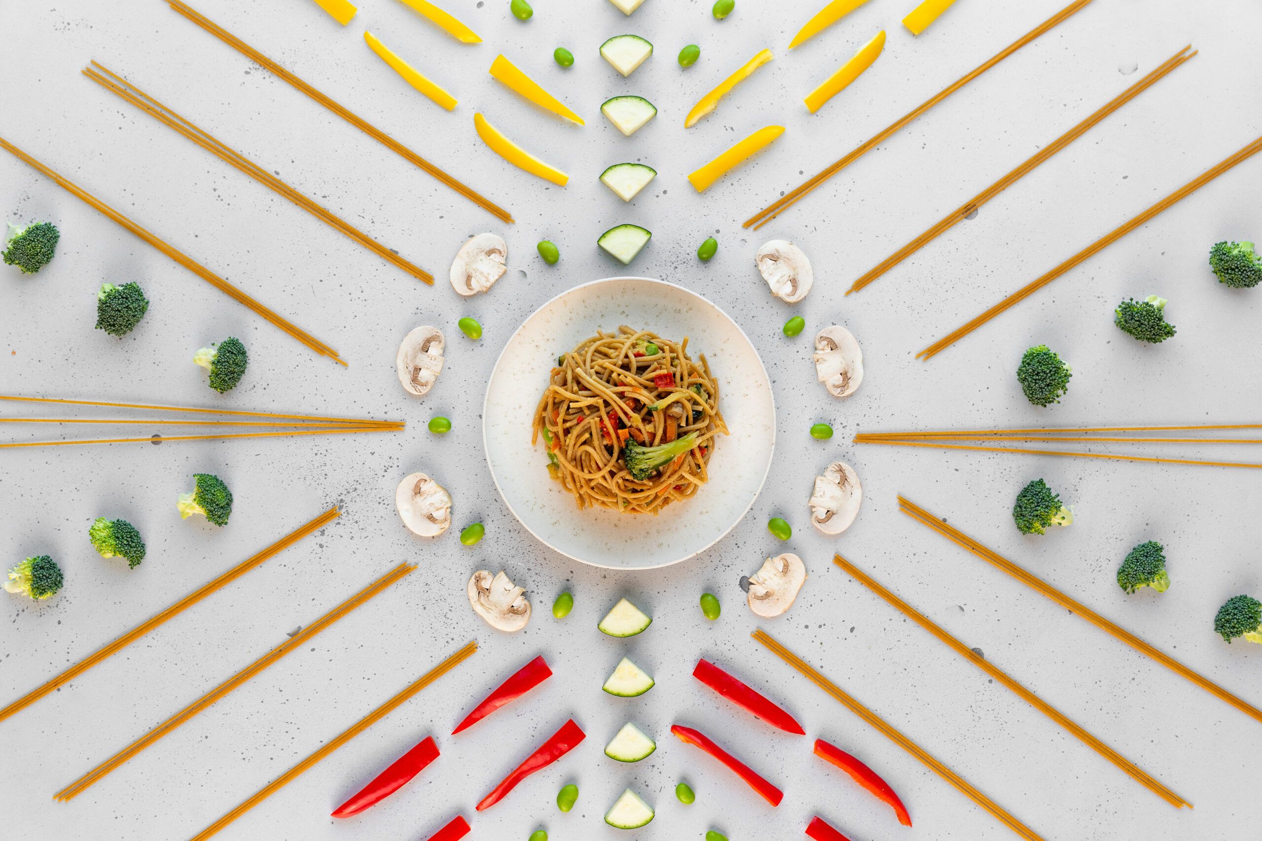 Courgette, broccoli, paprika, champignon, wortel en edamame.