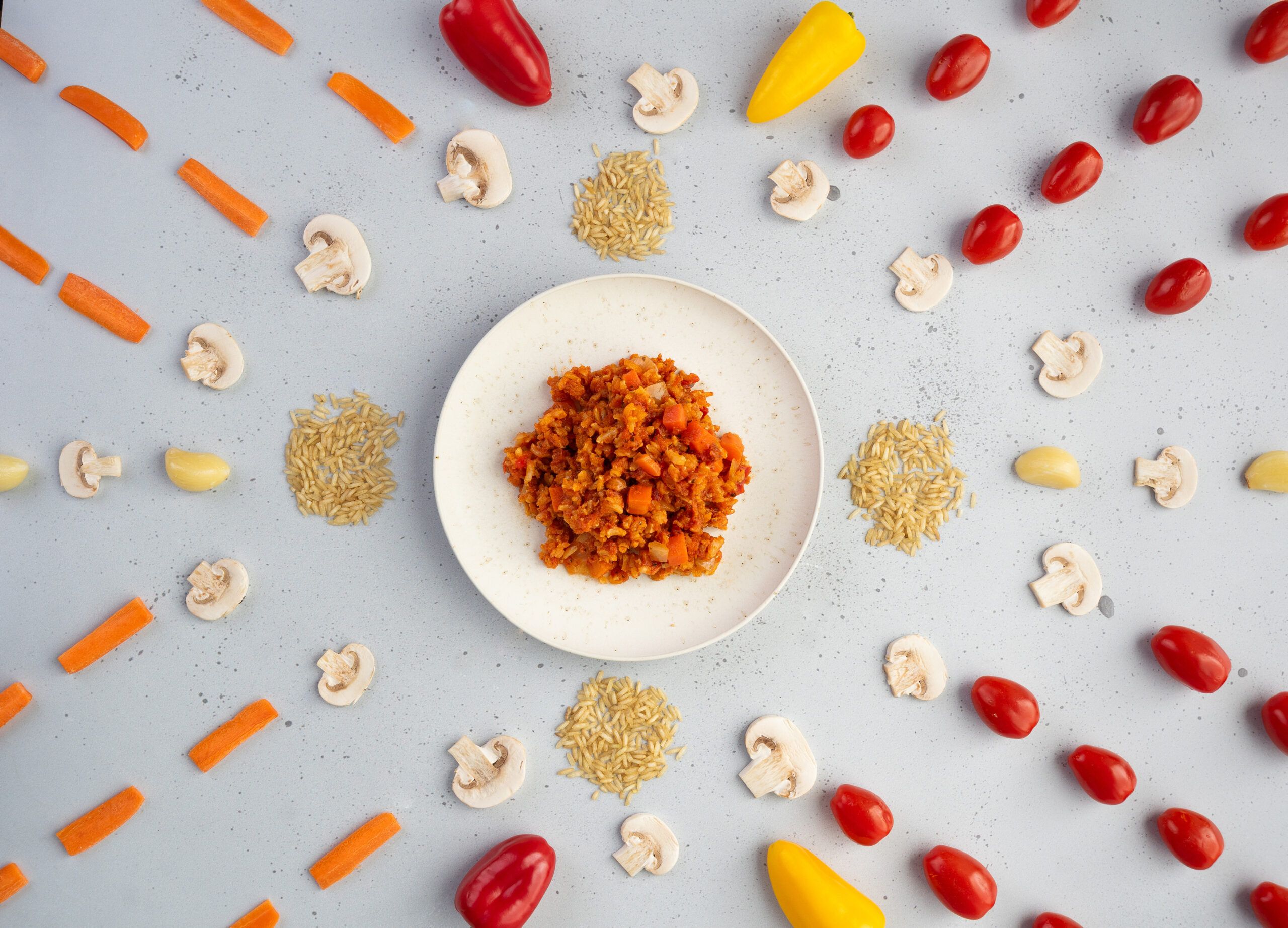 Volkoren basmatirijst (25%) (water, volkoren rijst), tomaat (25%), tomatenpuree (10%), water, wortel (7%), ui (6%), paprika (6%), raapzaadolie, champignon (4%), tapiocazetmeel, kruiden en specerijen, zout, knoflook, erwteneiwit.
